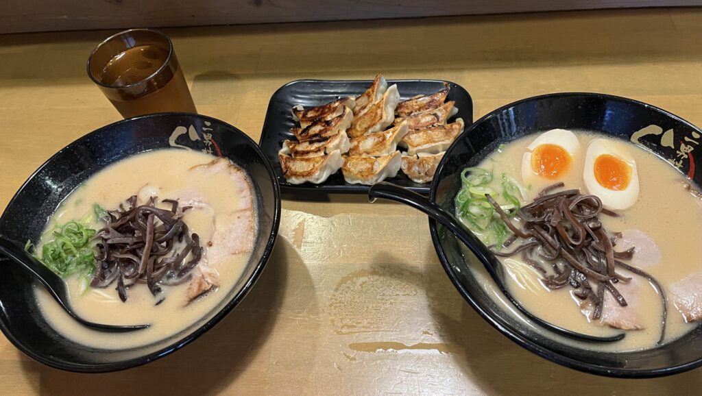 注文したのはラーメン2杯と餃子がセットになった2人向けのセットに、トッピングで味玉を追加。移動とライブ前の腹ごしらえとしてちょうど良いボリュームで、人気店に固執しない選択の大切さを実感しました。