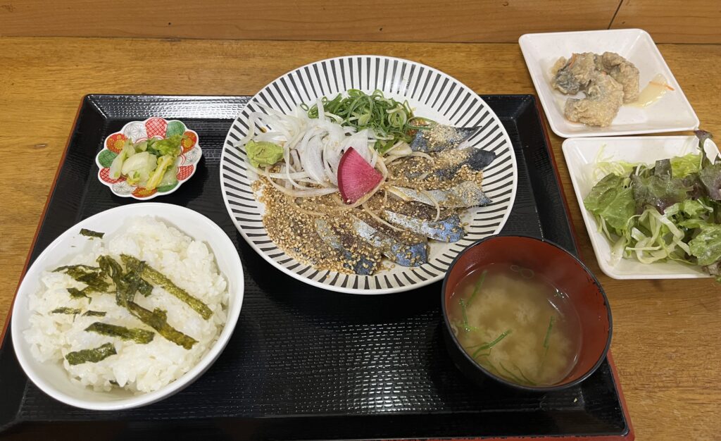 注文したのはトロサバ丼定食(1,600円)。セルフサービスの南蛮漬けやお漬物もあり、ボリューム・満足度ともに高いランチでした。