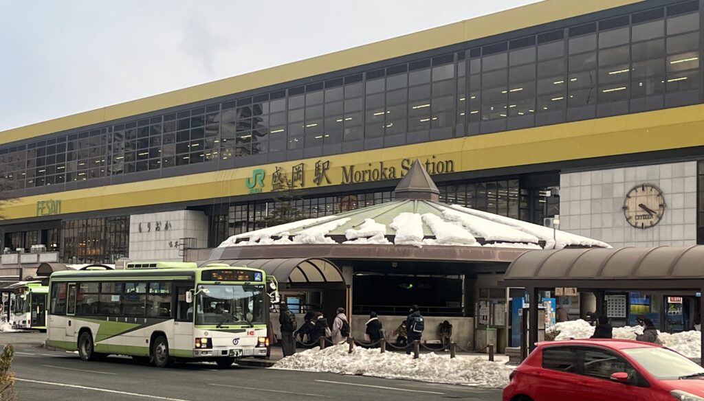 朝6:30ごろに東京を出発し、新幹線で盛岡駅へ向かいました。所要時間は約2時間。思っていたよりもあっという間で、車なしでも十分現実的な距離感です。スノーボードや大きめの荷物を持っての移動でしたが、新幹線内はスペースにも余裕があり、特に不便は感じませんでした。