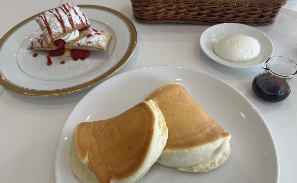 パンケーキはふわふわで軽く、食後でも食べやすい美味しさでした。ミルフィーユもサクサクで、どちらも満足度の高いスイーツでした。